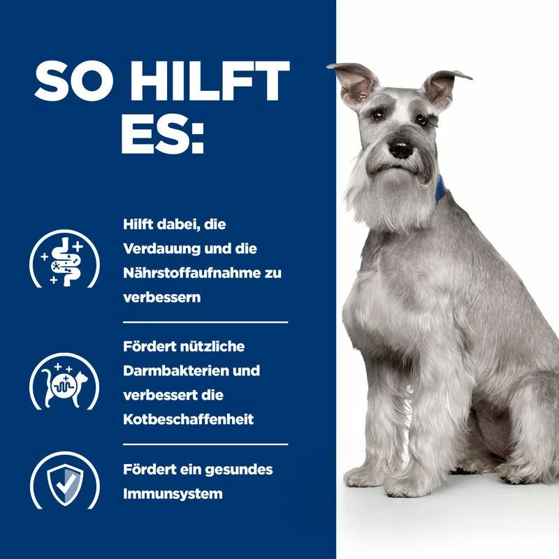- Hergestellt mit der Hill’s ActivBiome+ Technologie, eine einzigartige Mischung aus präbiotischen Fasern, die nachweislich das Mikrobiom des Darms rasch versorgen und somit eine gesunde Verdauung und das Wohlbefinden unterstützen