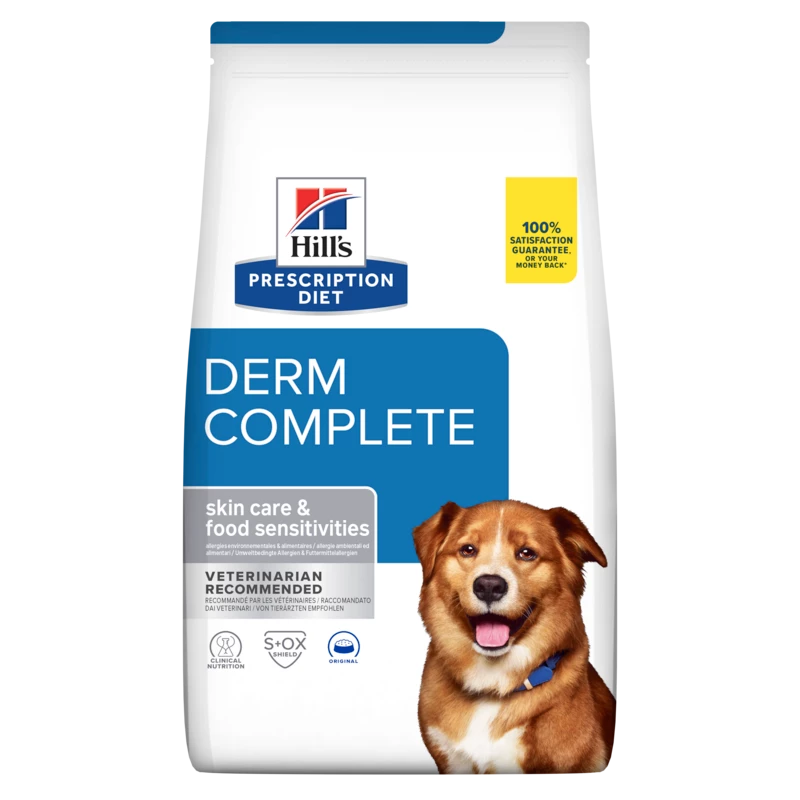 Hill’s PRESCRIPTION DIET Derm Complete Hundefutter ist die einzige klinisch erprobte Ernährung bei umwelt- und futtermittelbedingten Empfindlichkeiten. Dieses Hundefutter für Hunde mit empfindlicher Haut ist die einzige Ernährung bei umweltbedingten und futtermittelbedingten Allergien bei Hunden, wissenschaftlich unterstützt durch drei klinische Studien. Es ist ein Hundefutter mit einer begrenzten Auswahl an Zutaten zur Unterstützung des Managements von Allergien, trockener Haut, Juckreiz und Kratzen bei Hunden. Diese Trockennahrung für Hunde wird mit Reis und Ei hergestellt und hat einen köstlichen Geschmack, den Ihr Hund lieben wird.