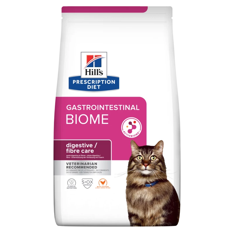 Hill’s PRESCRIPTION DIET GI Biome ist ein Katzenfutter mit hohem Fasergehalt und einer einzigartigen Mischung aus präbiotischen Fasern, die klinisch erwiesen einen regelmäßigen, gesunden Kotabsatz in nur 24 Stunden fördern und helfen, das Risiko für ein erneutes Auftreten zu reduzieren. Es wurde speziell zur Förderung eines gesunden Kotabsatzes und zur Unterstützung einer gesunden Verdauung entwickelt. Dieses Katzenfutter zur Unterstützung der Verdauung fördert außerdem ein Harnwegsmilieu, welches das Risiko für eine Bildung von Struvit- und Calciumoxalatkristallen reduziert. Dieses Trockenfutter für Katzen wird mit Huhn hergestellt und hat einen köstlichen Geschmack, den Ihre Katze lieben wird.