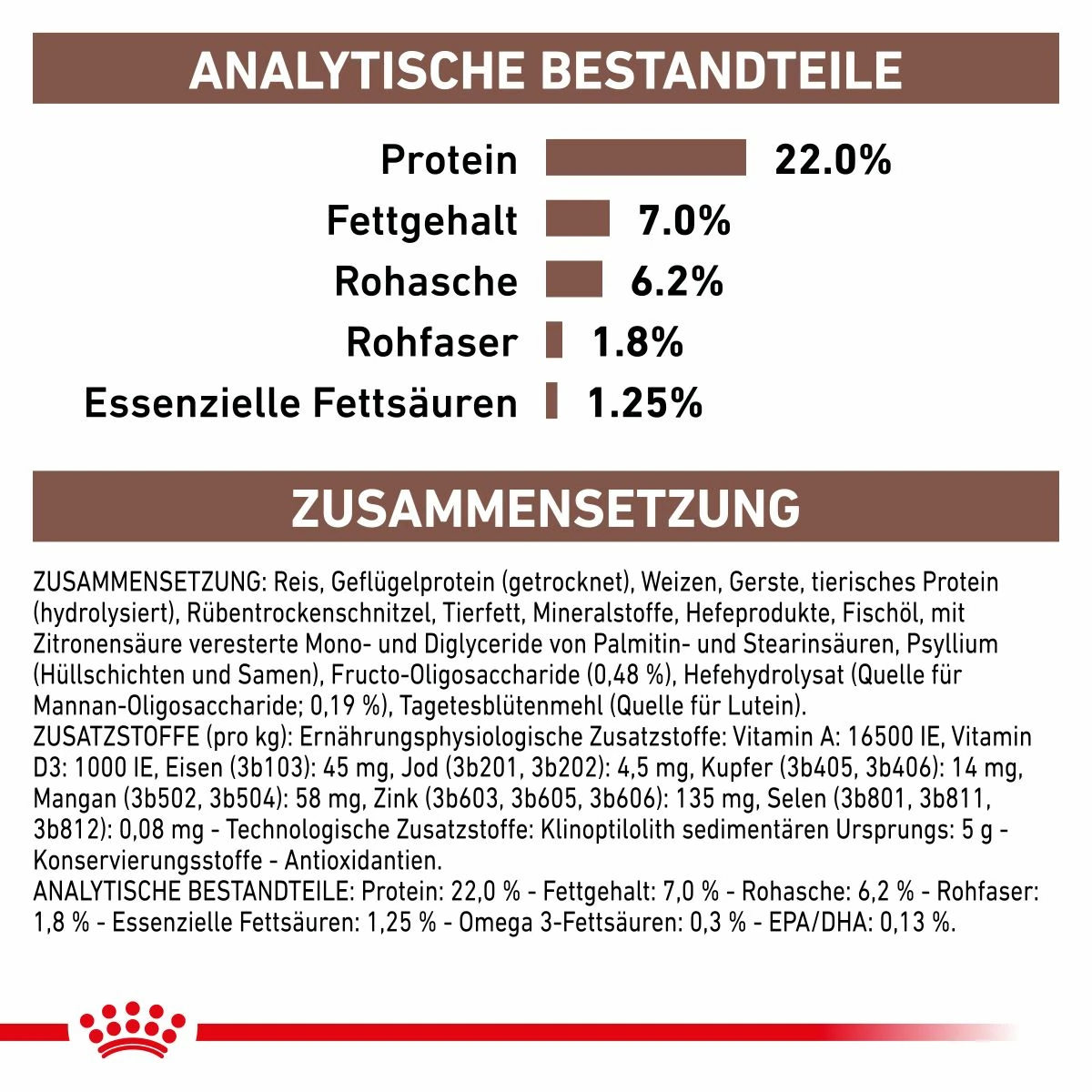 - Der Rohfasergehalt in Gastro Intestinal Low Fat ist reduziert, um eine optimale Nährstoffaufnahme im Darm zu unterstützen und eine hohe Verdaulichkeit zu ermöglichen.