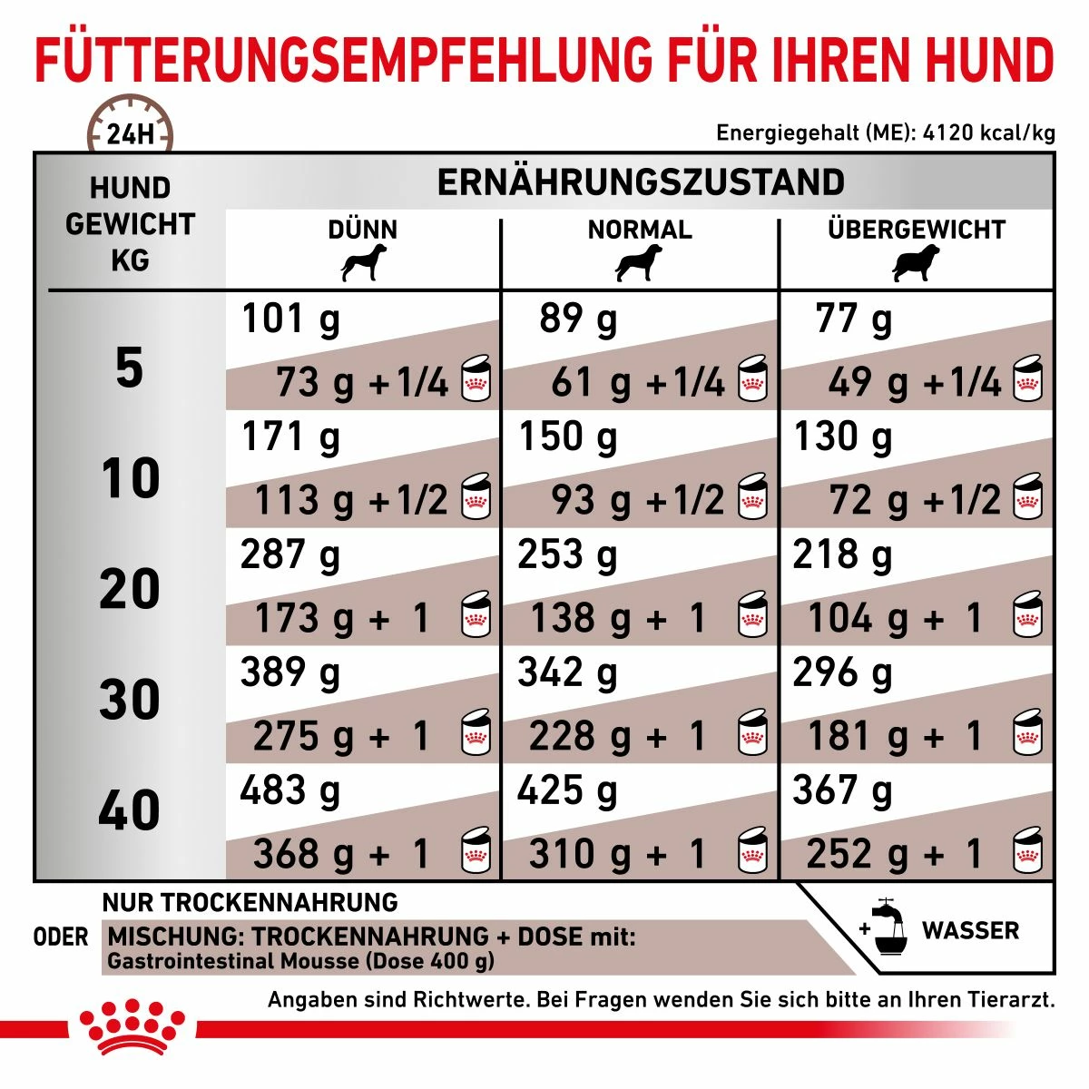 Hunde, die zur Gewichtszunahme neigen, sollten bei langfristig angelegter Fütterung auf Gastrointestinal Moderate Calorie umgestellt werden.